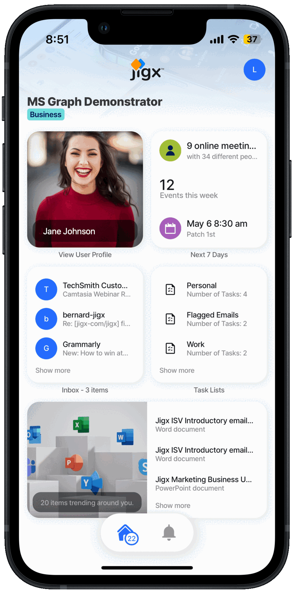 The [MS Graph](https://docs.jigx.com/building-apps-with-jigx/data/data-providers/rest/microsoft-graph-oauth) examples below use the User, Calendar, Mail, Insights, and To-do tasks resource types to create a powerful Jigx apps with everything you need in one app. The REST data provider requires you to [configure OAuth for MS Graph](https://docs.jigx.com/building-apps-with-jigx/data/data-providers/rest/microsoft-graph-oauth/configuring-oauth-for-ms-graph) and the accessToken is used in the Jigx function.